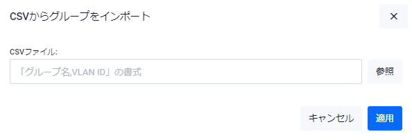 | CSVからインポートボタン | CSVファイル(カンマ区切りテキストファイル)からユーザーグループ情報をインポートするためのCSVからグループをインポートダイアログが開きます |