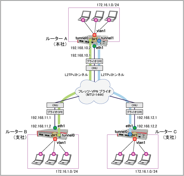 フレッツ・VPN プライオサービスを利用して、3つの拠点間(ハブ&スポーク型)をL2TPv3 VPNでL2(ブリッジ)接続する構成です。