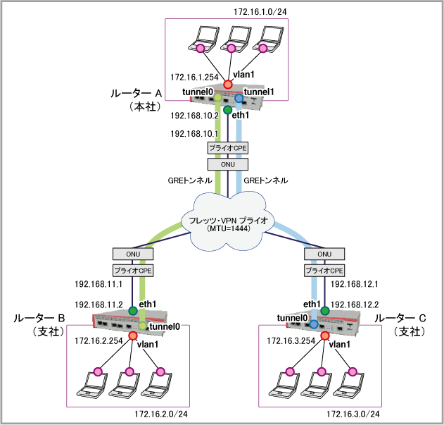 設定例集#90: フレッツ・VPN プライオを利用した3拠点間GRE接続
