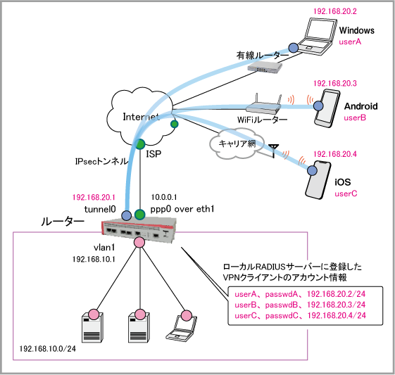 | ユーザーA | userA | passwdA | 192.168.20.2/24 |