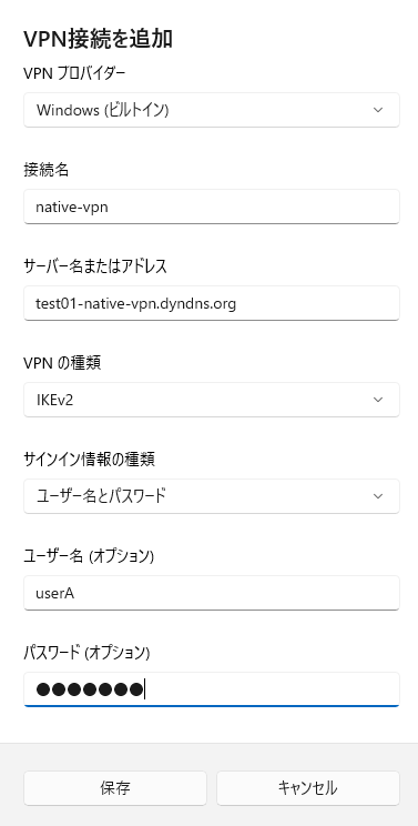 | ホスト名 | test01-native-vpn.dyndns.org |