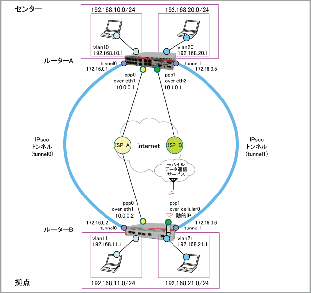 | WAN側IPアドレス(1) | 10.0.0.1/32 (ppp0) | 10.0.0.2/32 (ppp0) |