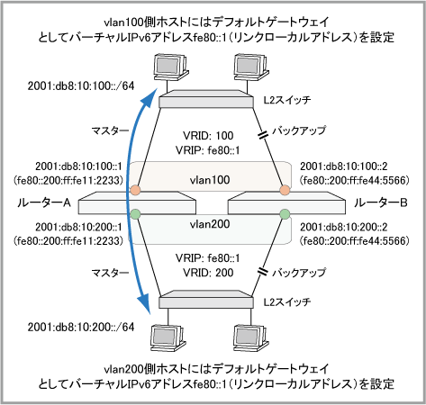 RouterB(config)# router ipv6 vrrp 100 vlan100 ↓