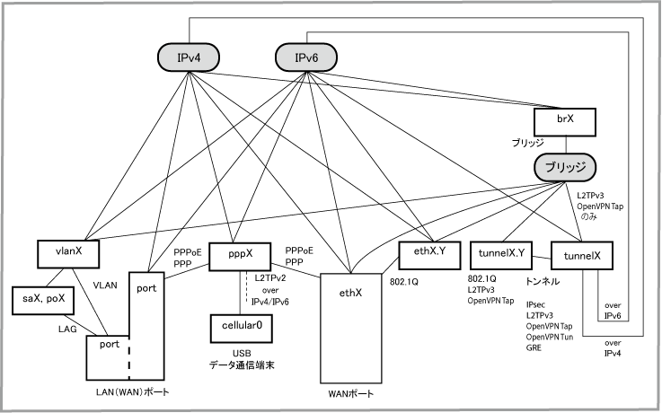L2TPv3とOpenVPN Tap(L2)トンネルインターフェースはおもにブリッジング用、IPsec、OpenVPN Tun(L3)、GREトンネルインターフェースはIPv4、IPv6のルーティング用インターフェースとして使用します。