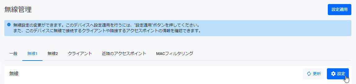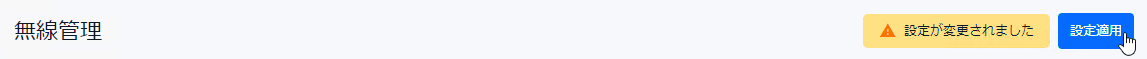 - 無線関連の設定を動作に反映するためWeb GUI画面の右上にある「設定適用」ボタンをクリックします。