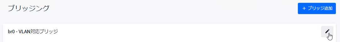 - 次にWeb GUIの左メニューから「ネットワーク基本設定」>「ブリッジング」の順に選択して「ブリッジング」画面を開き、「br0 - VLAN対応ブリッジ」欄の右上にある編集ボタン(鉛筆アイコン)をクリックします。