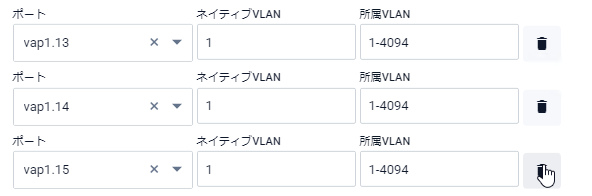 - ブリッジ番号「0」(br0)の「ブリッジ編集」画面でポート「vap1.15」の右端にある削除ボタン(ゴミ箱アイコン)をクリックし、br0のメンバーポートからvap1.15を外します。