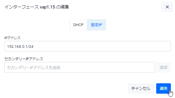- 「インターフェース vap1.15 の編集」画面で「固定IP」が選択されていることを確認し、「IPアドレス」に「192.168.0.1/24」を入力して「適用」ボタンをクリックします。