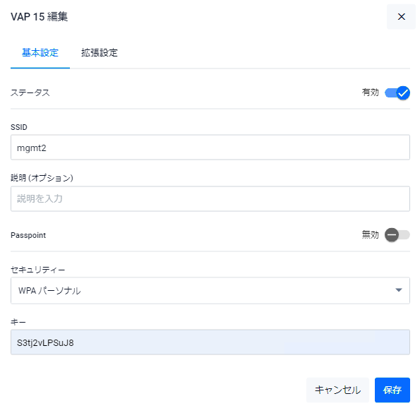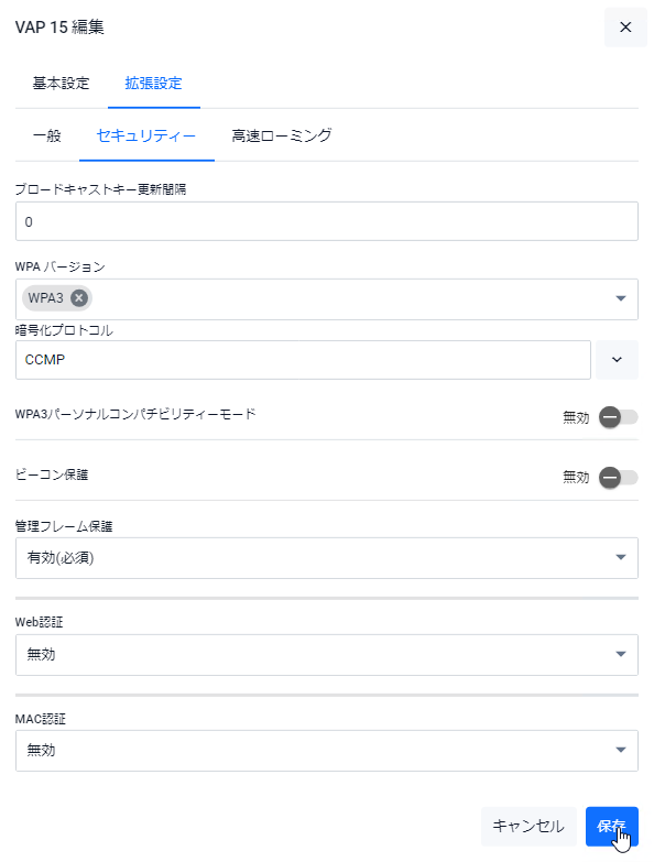 - 「VAP 15 編集」画面の「拡張設定」タブをクリックし、さらにその下の「セキュリティー」タブをクリックして下記項目を設定したら、「保存」ボタンをクリックして「VAP 15 編集」画面を閉じます。
