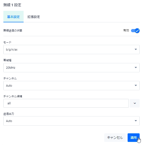 - 「無線 1 設定」画面で「無線送信の状態」を「有効」に変更し、「適用」ボタンをクリックして「無線 1 設定」画面を閉じます。
