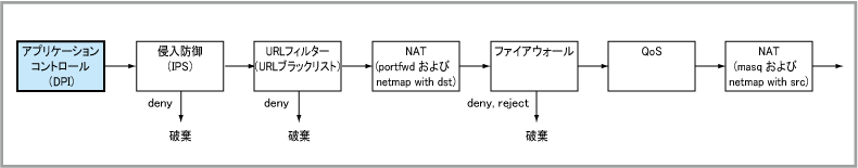 アプリケーションコントロール(DPI)機能では、各アプリケーション固有の通信パターンを検出するために一定量のパケットを受信してそのデータ部分を検査する必要がありますが、ファイアウォールはその仕様として初期設定ですべてのパケットを破棄するため、ファイアウォールとアプリケーションコントロール(DPI)を併用する場合は注意が必要です。