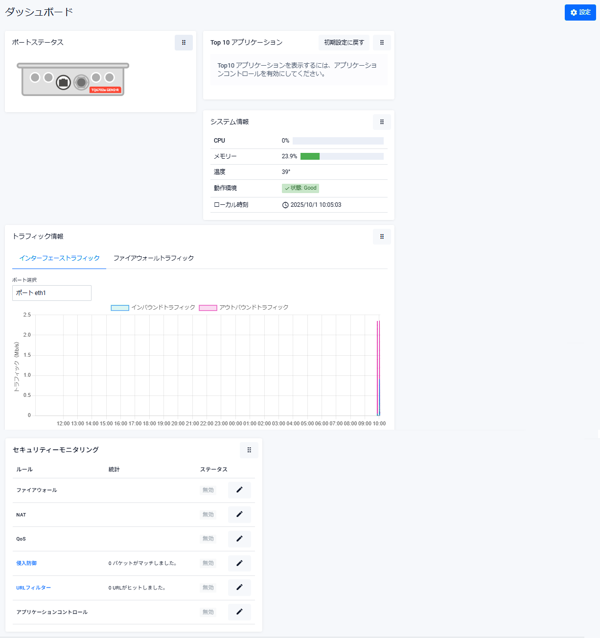 - Top 10 アプリケーション - アプリケーションコントロール(DPI)機能の使用時に検出されたアプリケーションの上位10件を表示します。