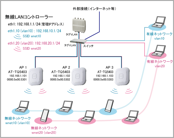 | 1 | 192.168.1.0/24 | 無線LANコントローラーと管理下APの通信に使用する管理用VLAN |