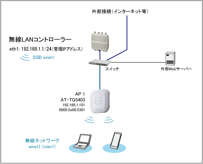 Note無線クライアントに割り当てられるIPアドレスから無線APのIPアドレスを参照できるよう、無線APの上位のスイッチ側で適切に設定する必要があります。また、AT-TQ6602、AT-TQ5403、AT-TQm5403、AT-TQ5403e、AT-TQ1402、AT-TQm1402ではキャプティブポータルのTCPポート番号として8080(HTTP)および8443(HTTPS)を使用しますので、上位のスイッチにてアクセスリストを適用している場合は、該当TCPポートの通信を許可する必要があります。