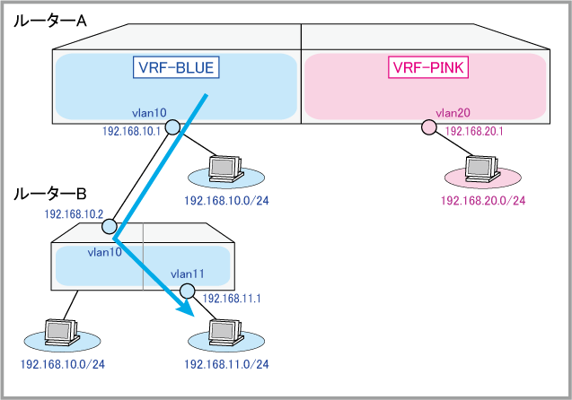 NoteVRFインスタンス間通信を行っているときはVRFインスタンス間で経路情報を送受信するため、各VRFインスタンスの独立性はなくなります。そのため、VRFインスタンス間で重複するIPアドレス空間は使用できません。