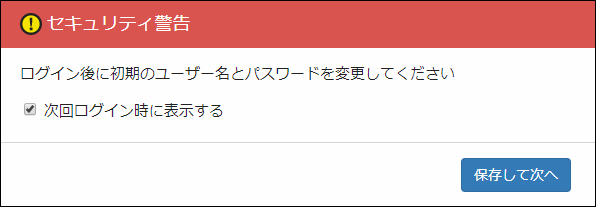 Noteデフォルトのユーザー名「manager」、パスワード「friend」でログインしたときは、次のセキュリティ警告が表示されます。ログインを続行するには「保存して次へ」をクリックしてください。