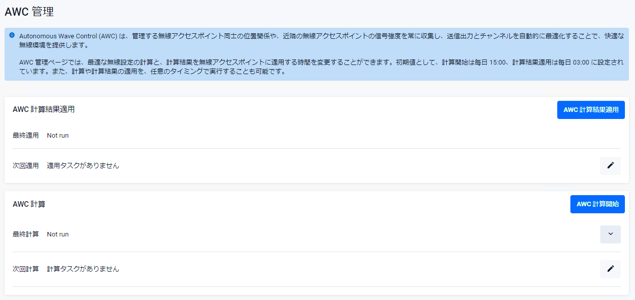 Note本設定はAWCプラグイン側から行われるため、無線管理画面からは操作しないでください。なお、AWCプラグインから操作できないといったトラブルシューティング時など、一時的に動作の停止が必要な場合は、ご使用に際して弊社技術担当にご相談ください。
