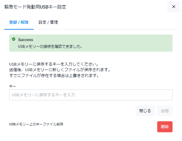 | 削除ボタン | USBメモリー上のキーファイルを削除します |