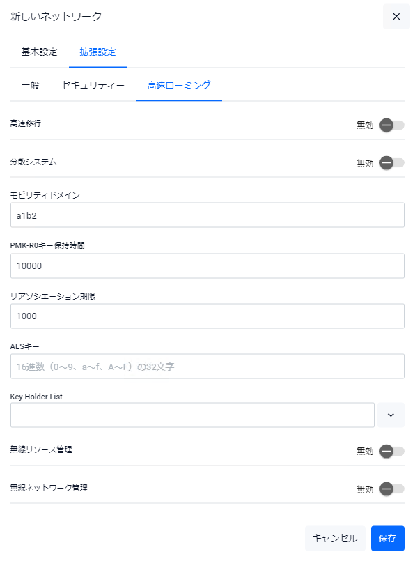 Note高速ローミングタブは「新しいネットワーク - 基本設定」の「セキュリティー」で「WPAパーソナル」か「WPAエンタープライズ」を選択したときだけ表示されます。