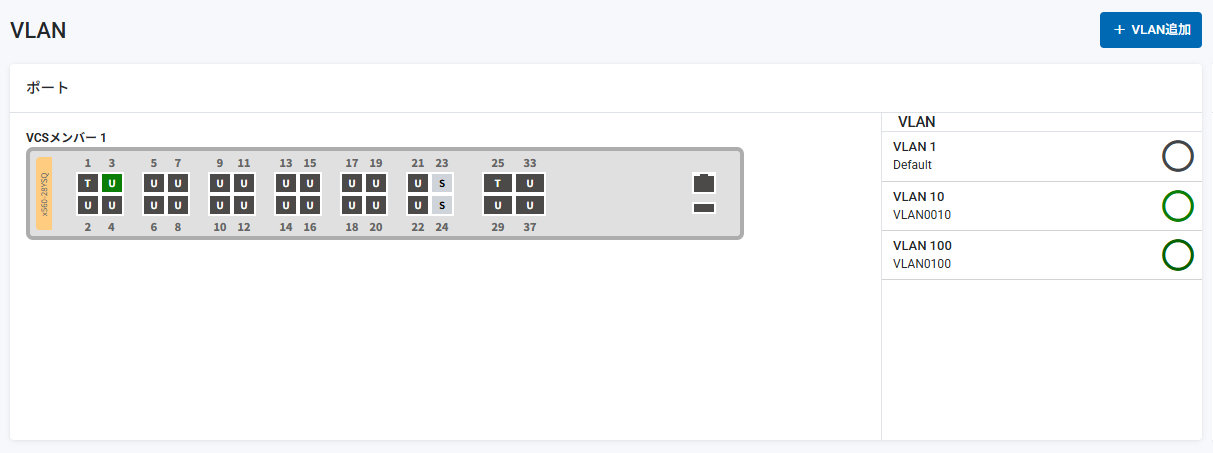 | ポート | 各スイッチポートのタグ設定と所属VLANが視覚的に表示されます。 ・無色U - 初期設定ポート(明示的なVLAN設定のない、vlan1所属のタグなしポート) ・U - タグなしポート(アクセスポート) ・T - タグ付きポート(トランクポート) 各ポートの所属VLANは、該当ポートにマウスカーソルを当てると表示されるポップアップによって確認できます。 また、タグなしポートでは所属VLANが「VLAN」一覧の色でも示されます。 一方タグ付きポートは、「VLAN」一覧で選択中のVLANに所属していれば背景色が該当VLANの色になり、そうでなければ背景色が濃い灰色になります。 ポートをクリックまたはマウスカーソルを当てることで該当ポートのタグ設定と所属VLANの変更およびネイティブVLANの設定をすることもできます。詳細は「タグ設定・所属VLANの変更・ネイティブVLANの設定」をご覧ください |