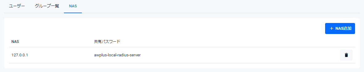 | 共有パスワード | 登録済みNAS・RADIUSサーバー間の通信に使用する共有パスワードが表示されます |