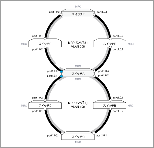 ここでは、スイッチAを共通MRMとし、A、B、C、DでMRPリング「1」を、A、E、F、GでMRPリング「2」を形成する複数リング構成の基本的な設定手順を説明します。