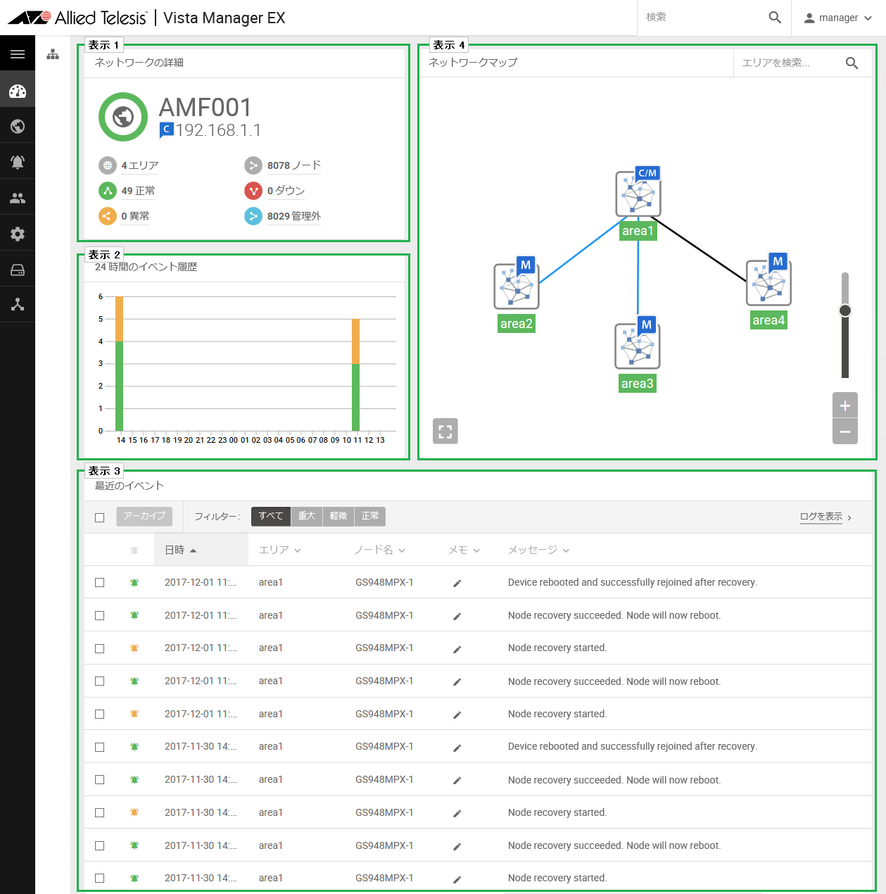 ダッシュボードをクリックすると、AW+で管理しているAMFネットワークがコンテンツ欄にパネルで表示されます。
