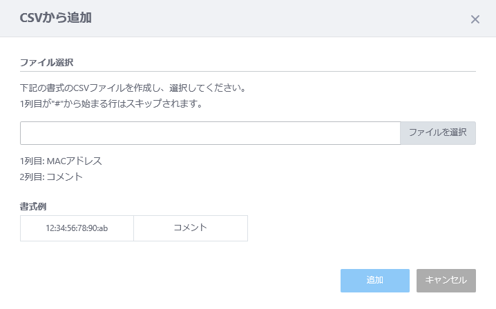 「CSVから追加」ダイアログを開きます。 CSVファイルを選択してMACアドレスリストに追加することができます。 ![]()