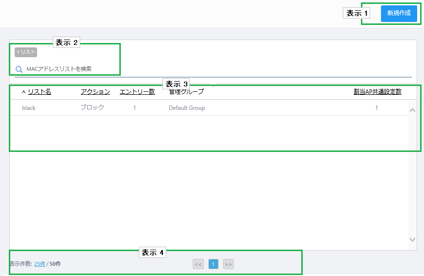 | リスト名 | MACアドレスリストの名前が表示されます。 |