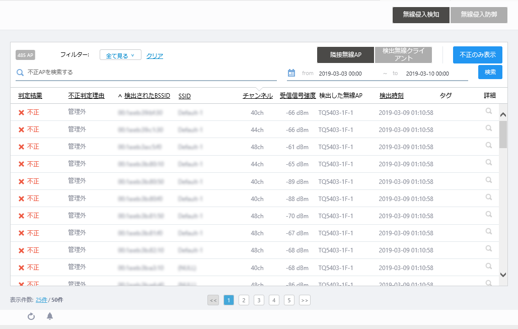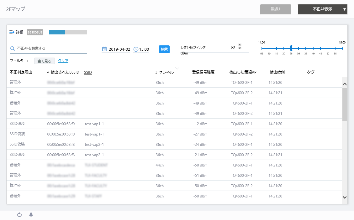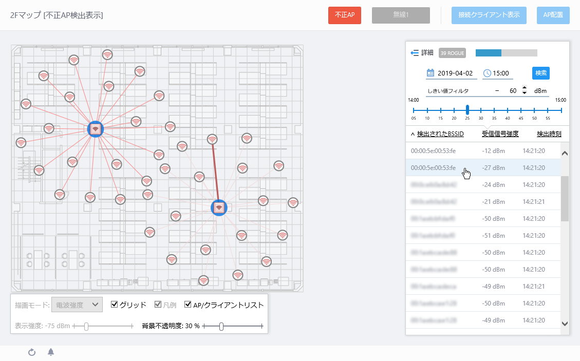 Noteまた、リストを拡張表示に切り替えると、検出されたBSSIDのそれぞれの不正判定理由やSSIDやSSID、検出した無線AP名などを確認することができます。不正APのアイコンは、実際の設置場所にかかわらず、管理下APが検出したその他の不正APのアイコンと重ならないように表示されます。