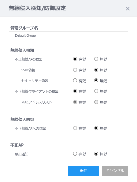 | 不正無線APの検出 | 不正無線APの検出を行うか否かを設定します。 「有効」の場合、AWCプラグインの管理外の無線APを不正無線APと見なします。 |
