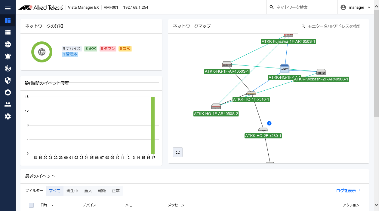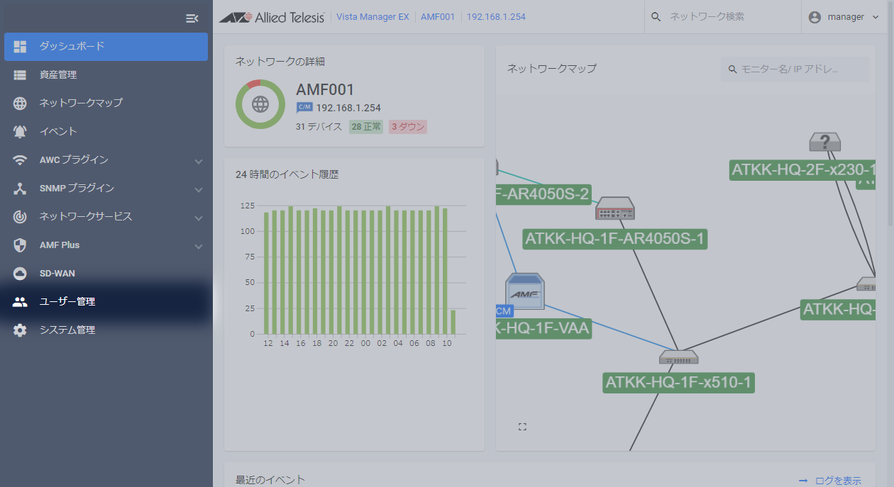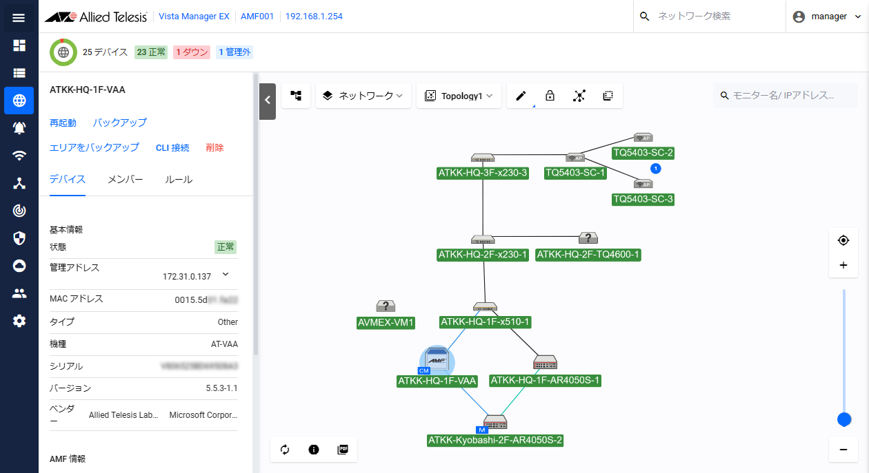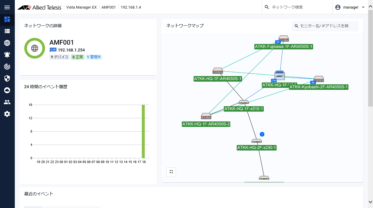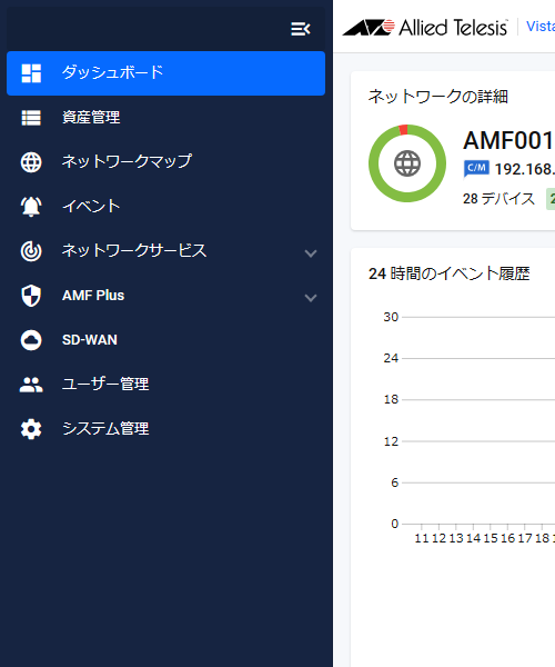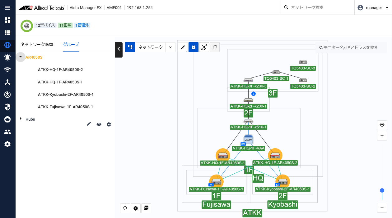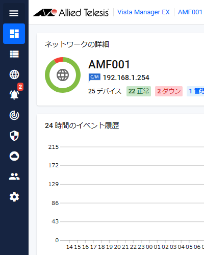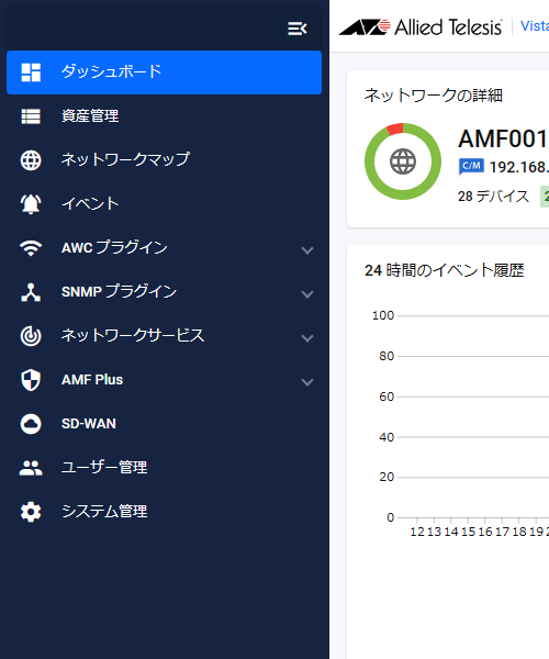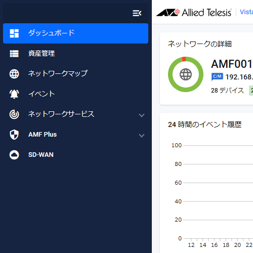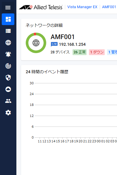 AT-Vista Manager EXは、弊社スイッチやルーター/UTMなどのAMF(アライドテレシスマネージメントフレームワーク)対応製品で構成されるAMFネットワークを自動認識し、Webブラウザー上でグラフィカルに管理するためのネットワークマネージメントソフトウェアです。