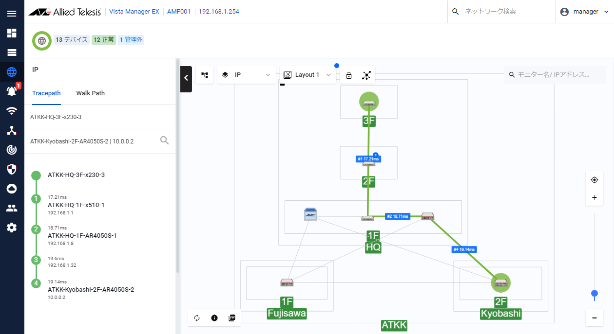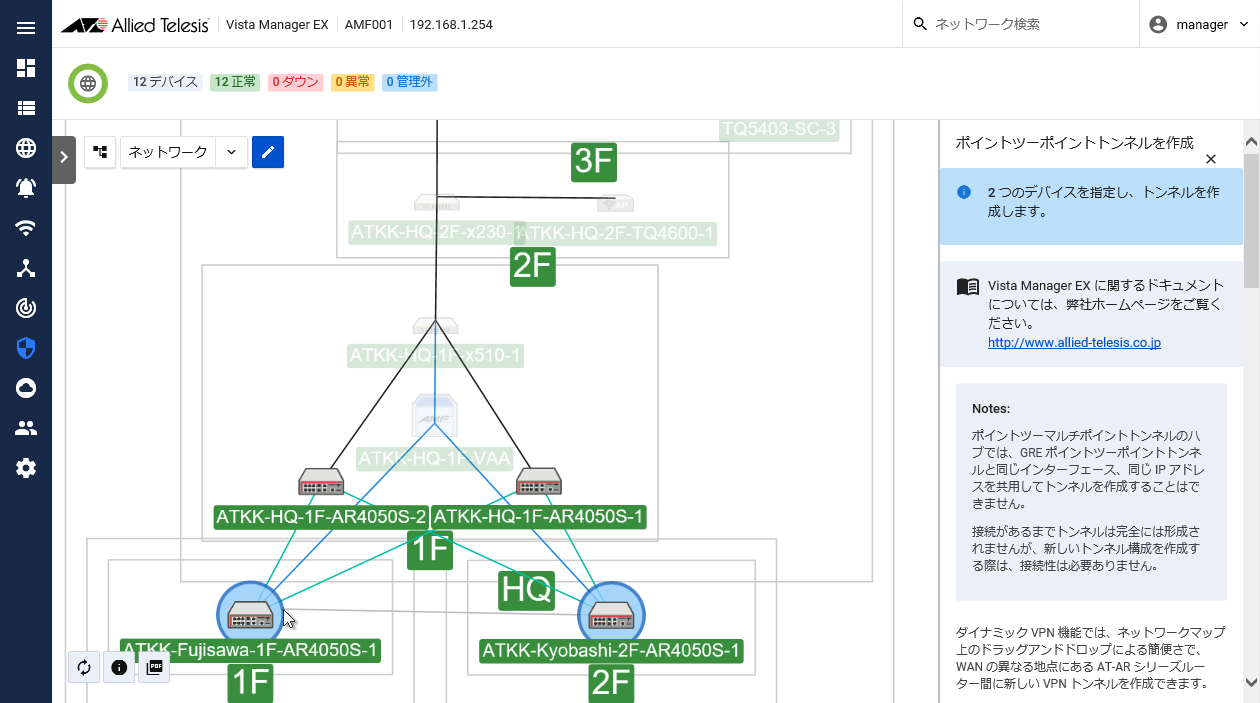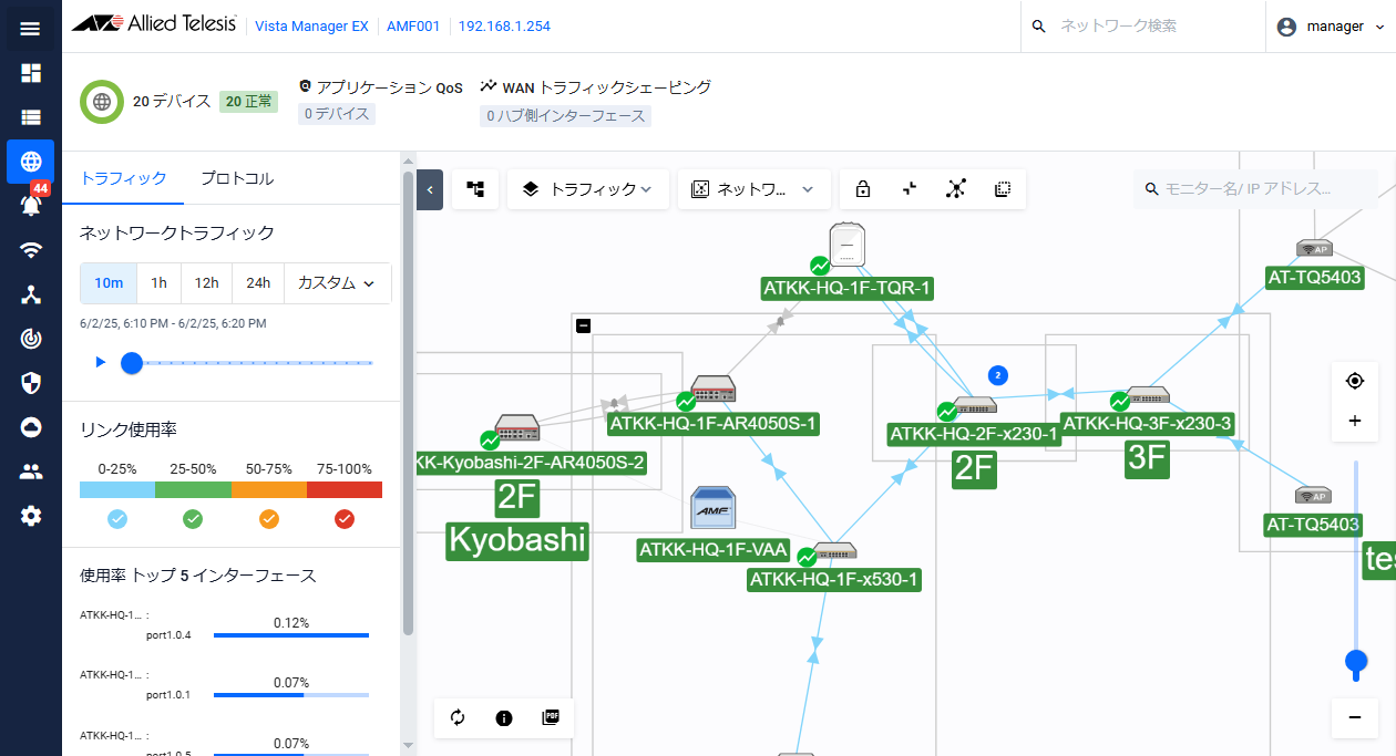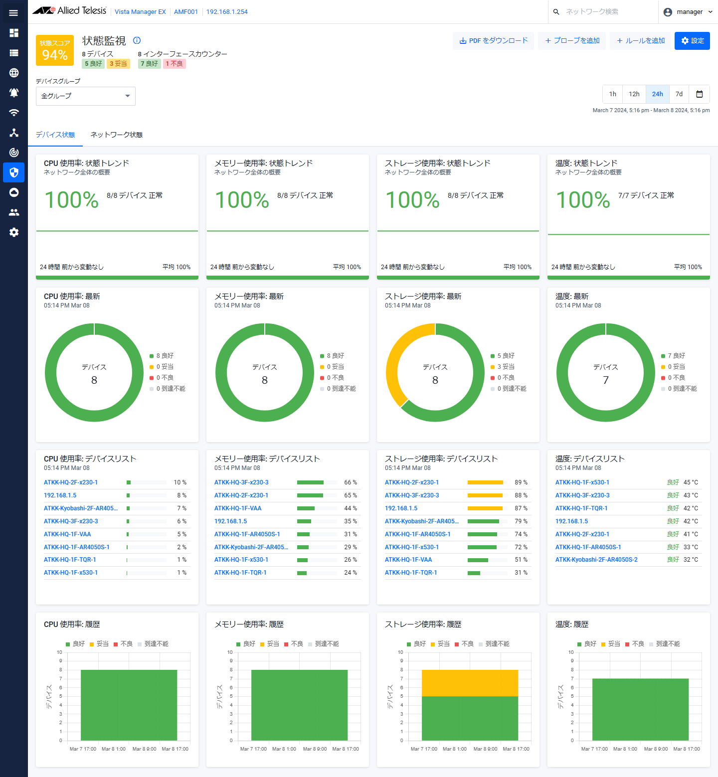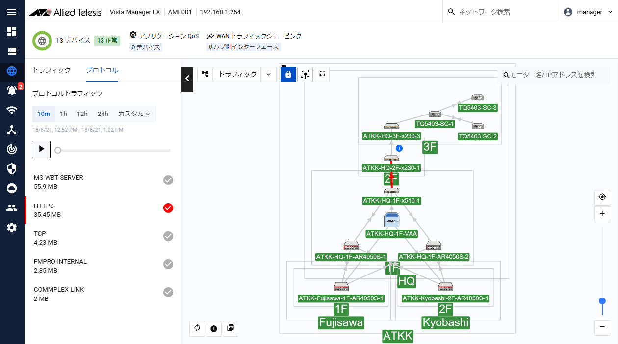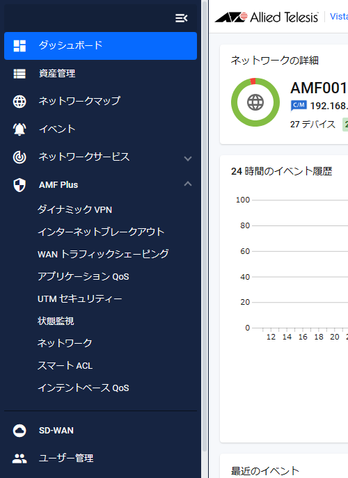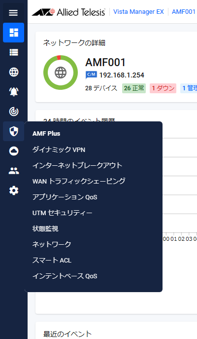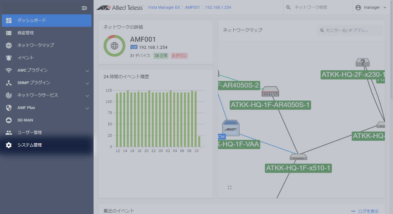 AT-Vista Manager EXは、弊社スイッチやルーター/UTMなどのAMF(アライドテレシスマネージメントフレームワーク)対応製品で構成されるAMFネットワークを自動認識し、Webブラウザー上でグラフィカルに管理するためのネットワークマネージメントソフトウェアです。