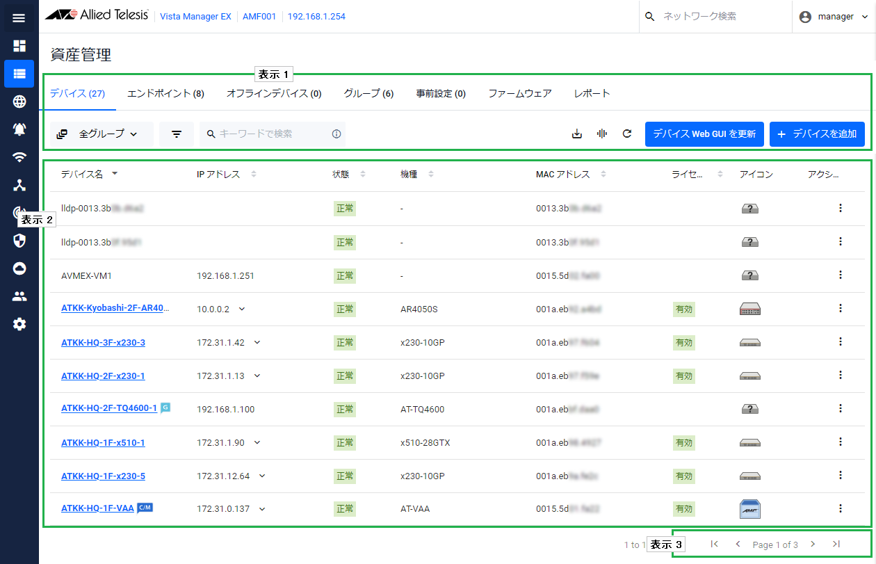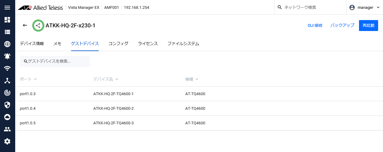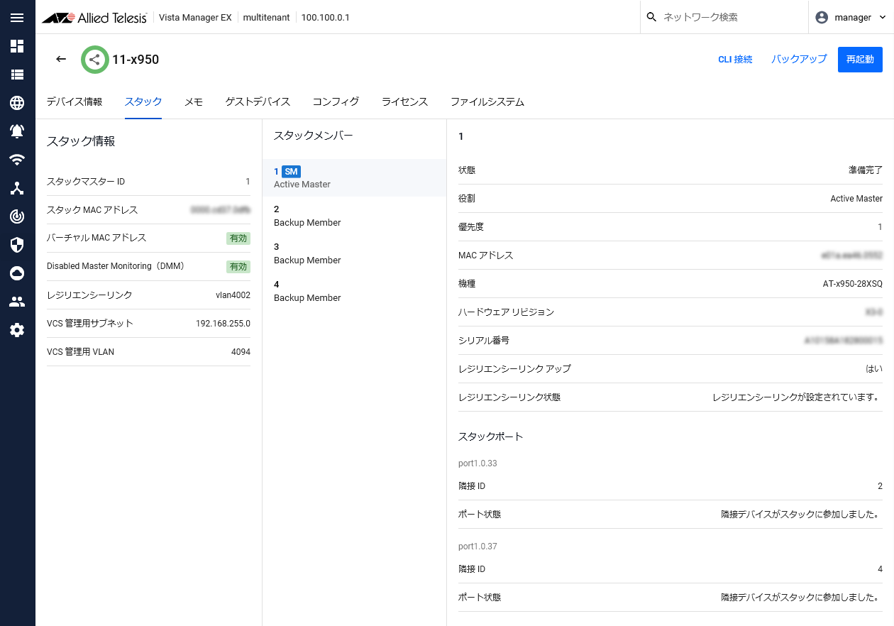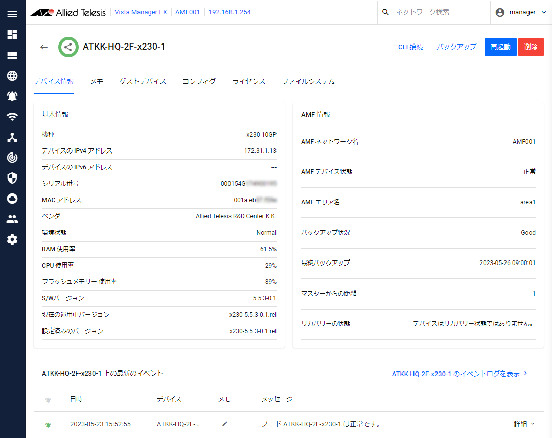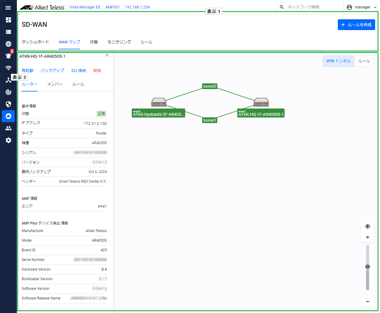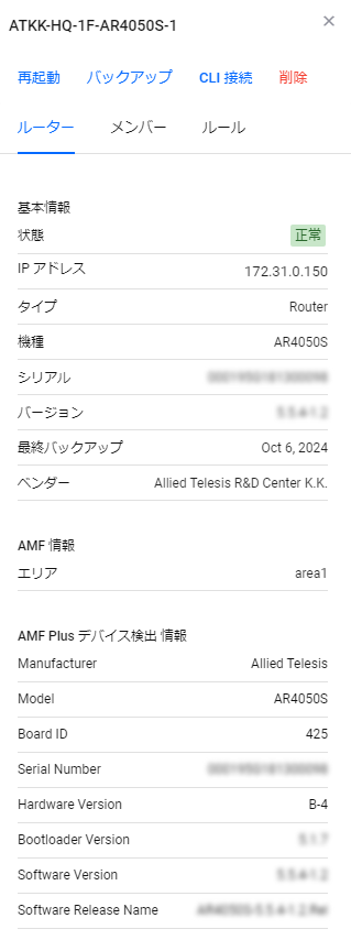 デバイス名 | AMF/AMF Plusマスターまたはコントローラーのデバイス名を表示します。 | |||||||||||||