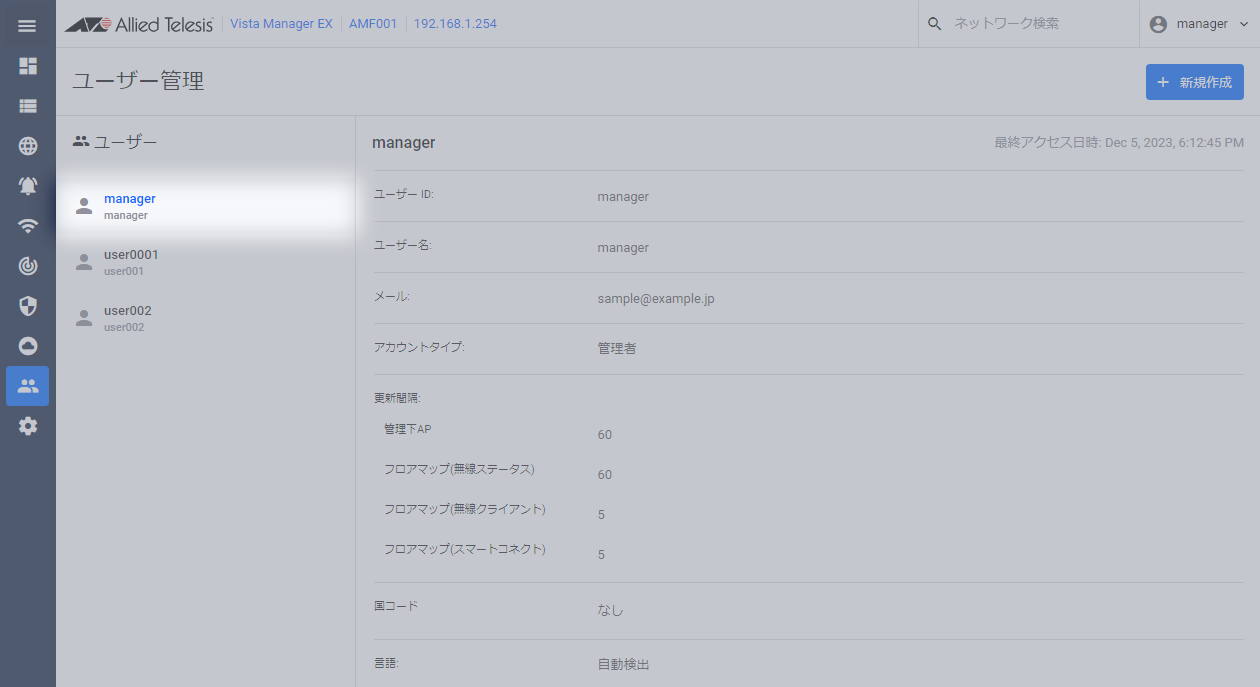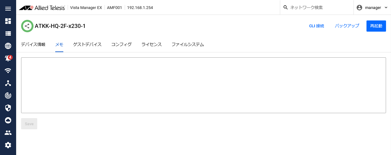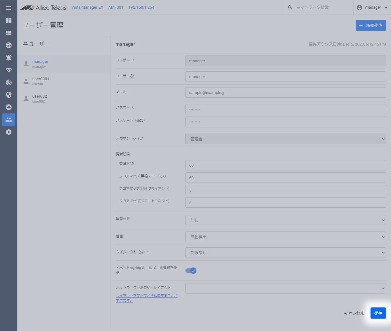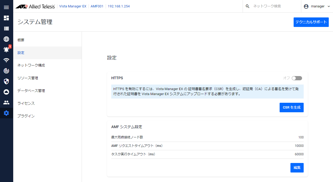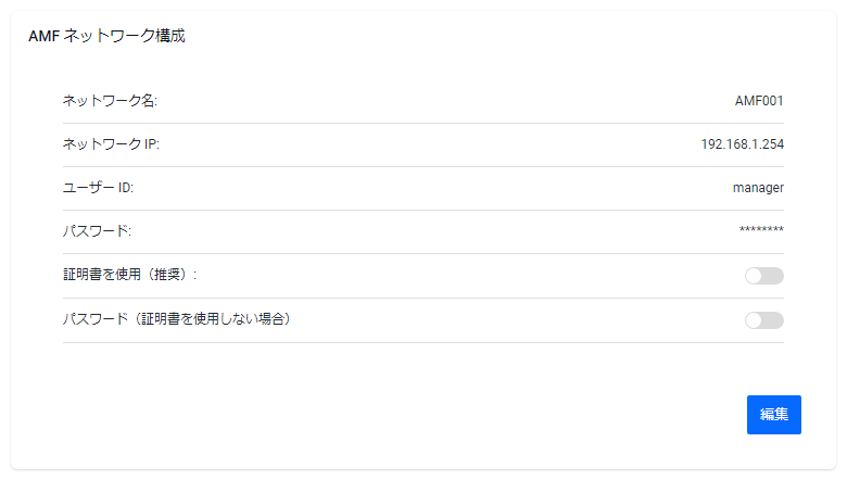 AMF Cloudアプリケーション | 192.168.1.4 | AMFマスターとして動作。 権限レベル15(特権レベル)ユーザーのユーザーID:manager 権限レベル15(特権レベル)ユーザーのパスワード:friend |