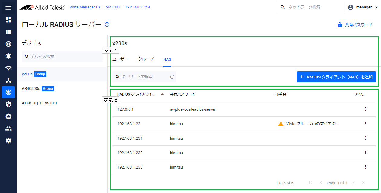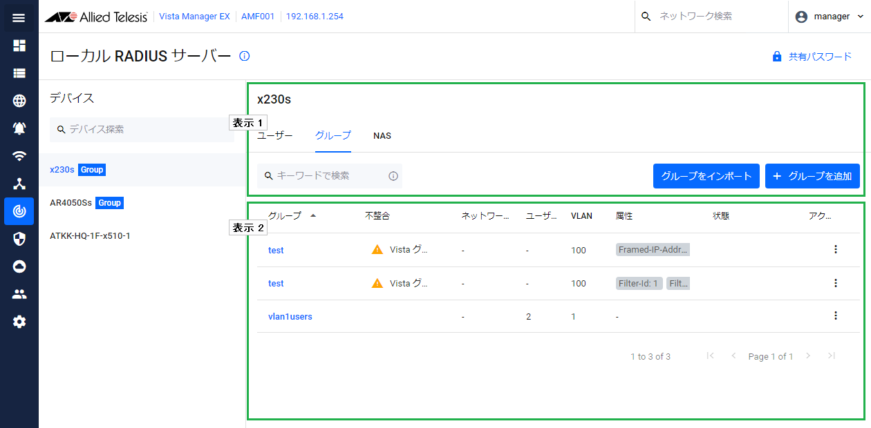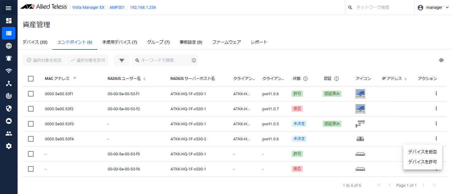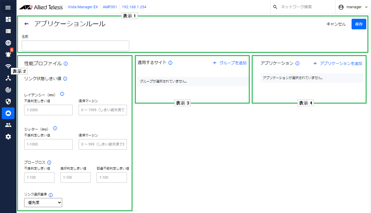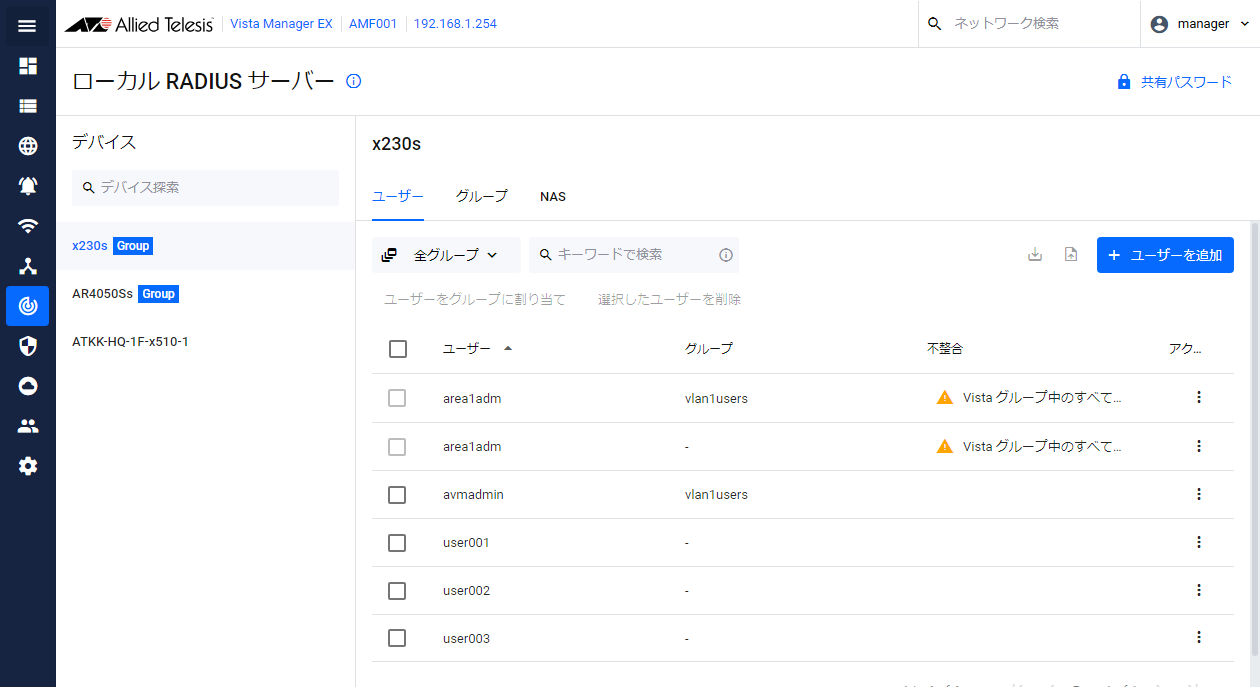 AMF Cloudアプリケーション | 192.168.1.4 | AMFマスターとして動作。 権限レベル15(特権レベル)ユーザーのユーザーID:manager 権限レベル15(特権レベル)ユーザーのパスワード:friend |