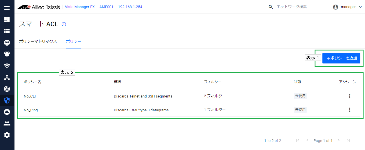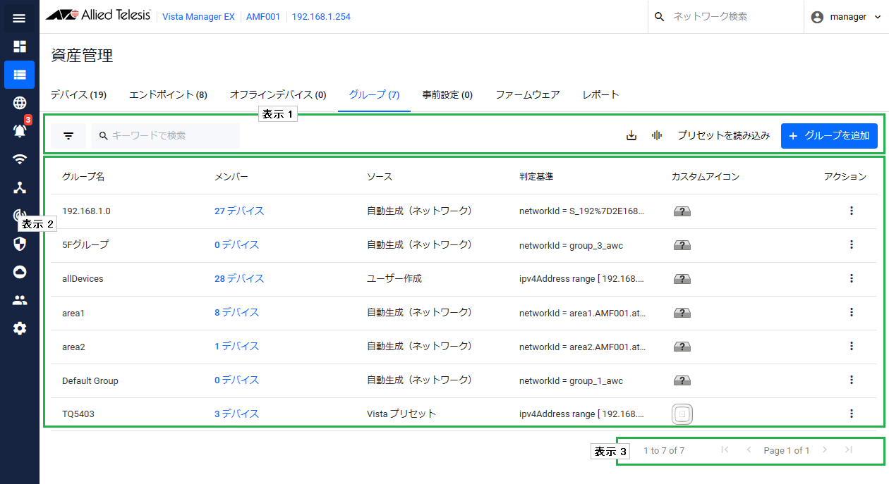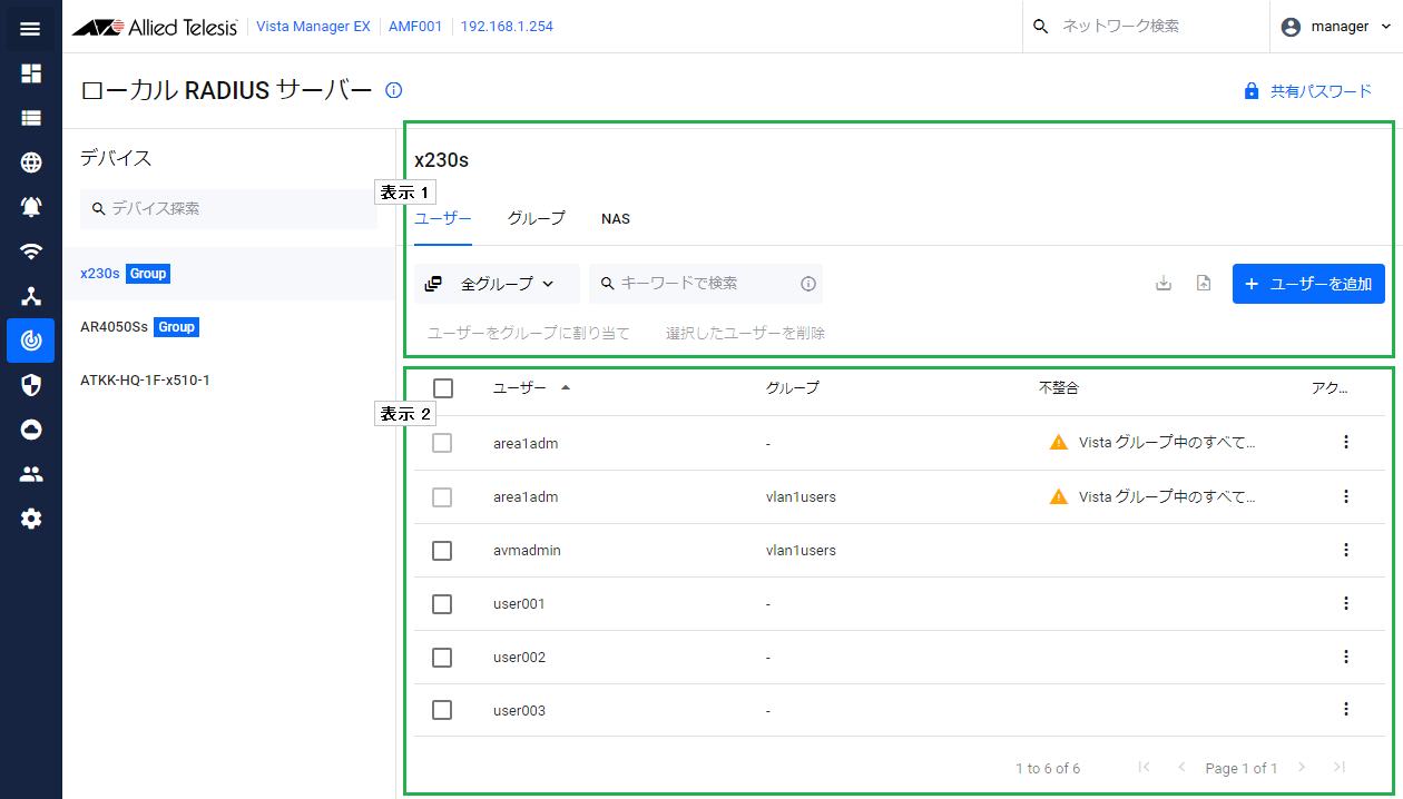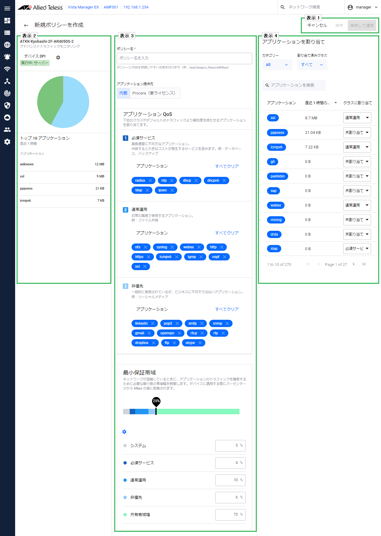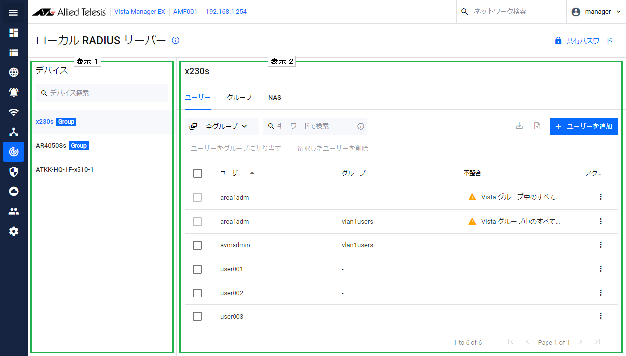 AMF Cloudアプリケーション | 192.168.1.4 | AMFマスターとして動作。 権限レベル15(特権レベル)ユーザーのユーザーID:manager 権限レベル15(特権レベル)ユーザーのパスワード:friend |