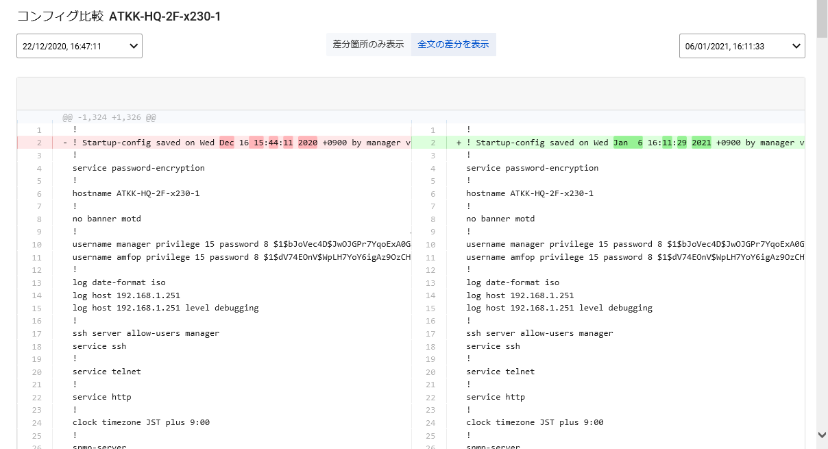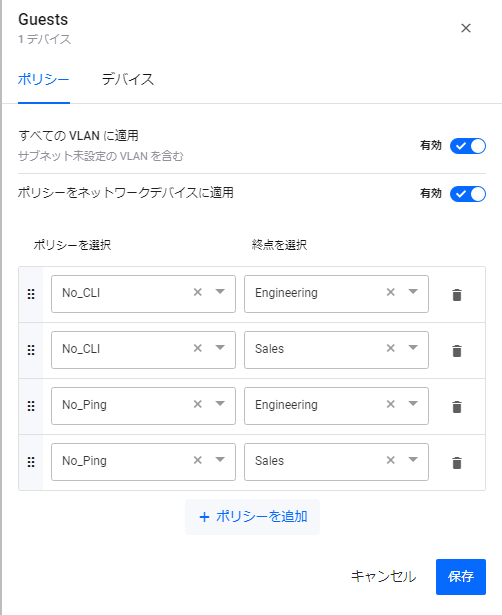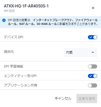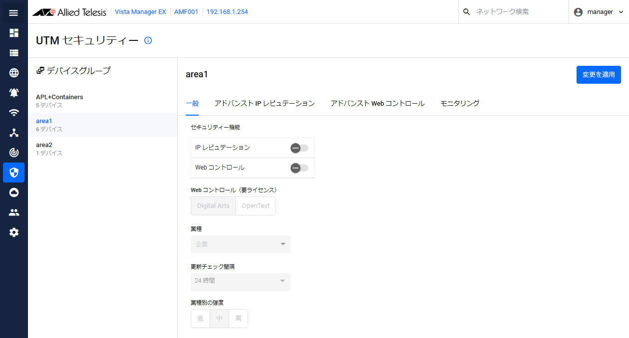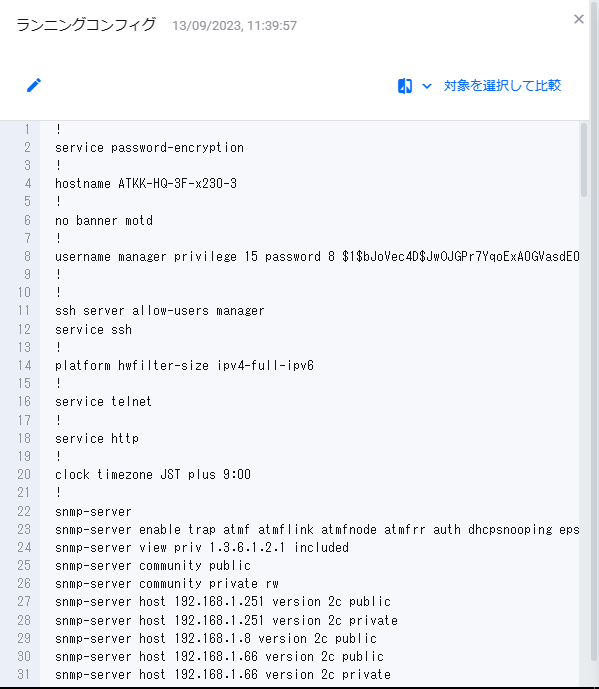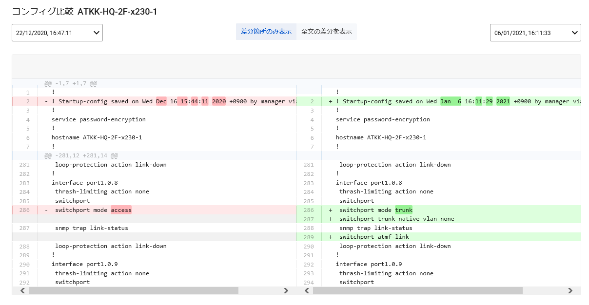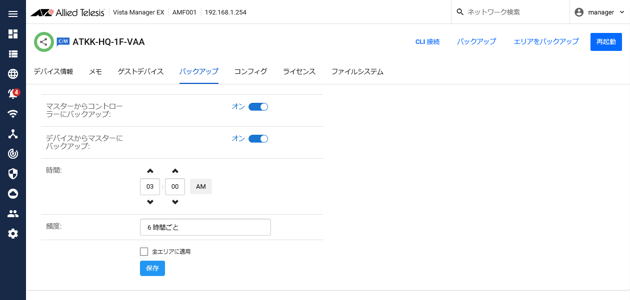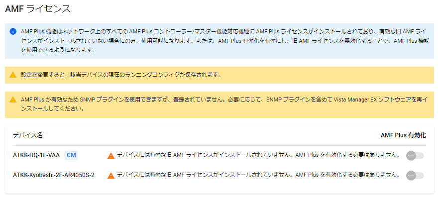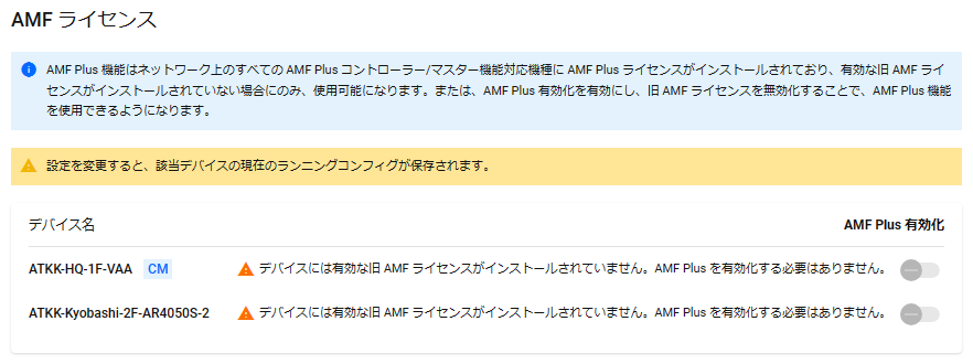 Note設定を変更すると、直ちに対象のデバイスのランニングコンフィグの変更がスタートアップコンフィグ(起動時コンフィグ)に保存されます。 NoteAMF Plus有効化スイッチの設定からデバイスのランニングコンフィグへの反映には数十秒かかります。 |