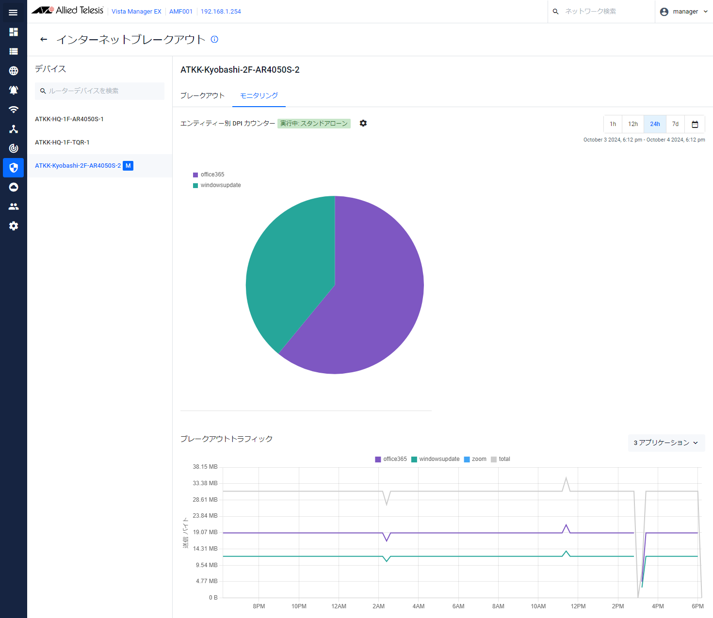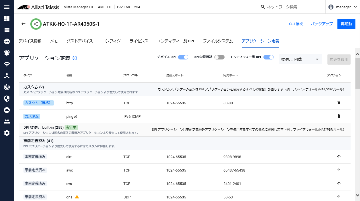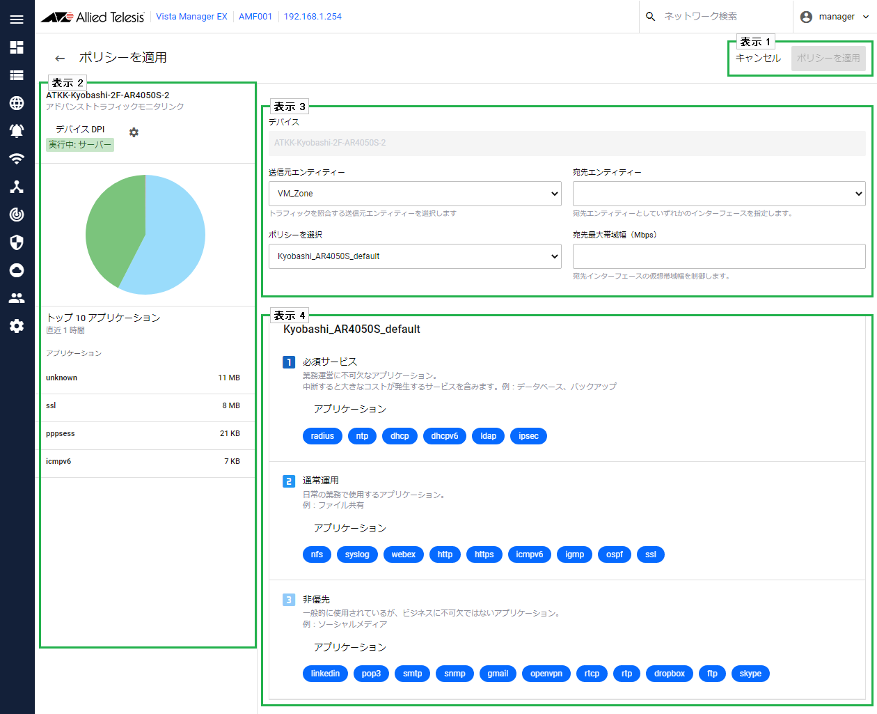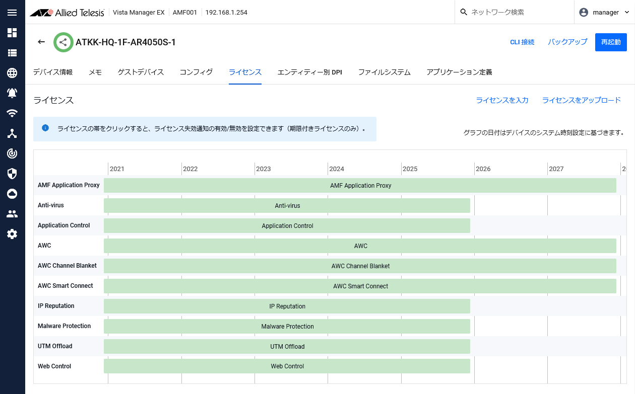 NoteダイナミックVPN、インターネットブレークアウト、WANトラフィックシェーピング、アプリケーションQoS、UTMセキュリティーの使用には、これら機能の中心となるAT-ARルーターに適切なライセンスを適用する必要があります。