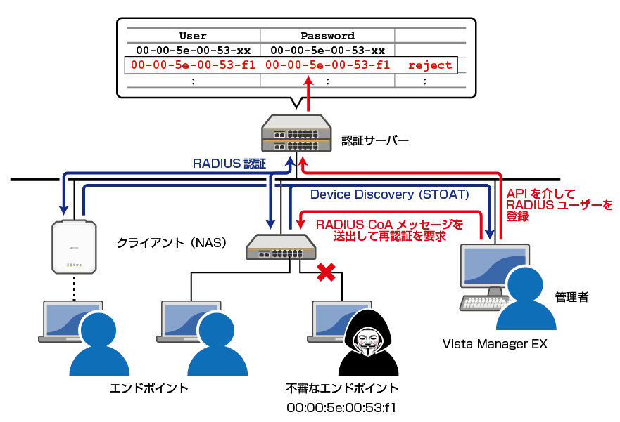 NoteAlliedWare Plus ファームウェアバージョン 5.4.7-2.x以降では、AVM EXの認証に電子証明書を用いたTLSクライアント証明書認証を使用することで、AMFデバイス側でのユーザー名、パスワード一本化が不要になります。詳しくは「TLSクライアント証明書認証」をご覧ください。