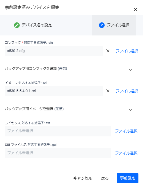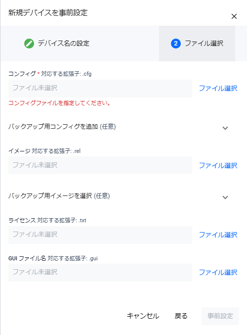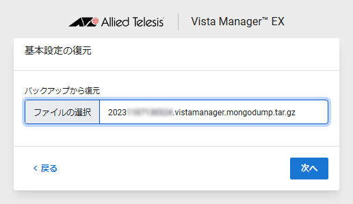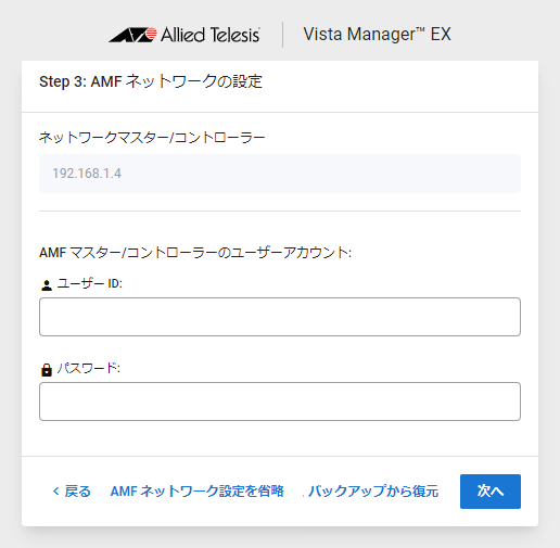 NoteAMFネットワーク設定を省略し、あとからAMFネットワークの管理機能を使用する場合、AMFネットワークの再設定の際に現在のAVM EXシステムで有効なライセンスをアップロードする必要があります。登録済みのライセンスを紛失した場合、弊社担当営業、代理店またはライセンス発行時にご案内する窓口までお問い合わせのうえ、ライセンスを再発行する必要があります。