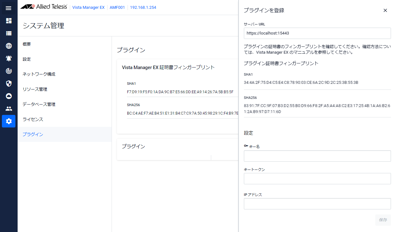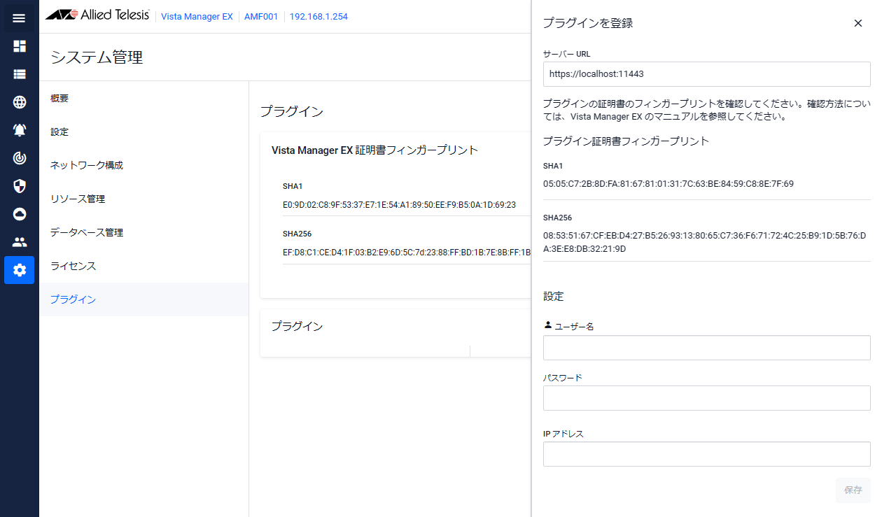 プラグイン証明書フィンガープリント | サーバーURLに入力されたURLが適切なプラグインのものである場合、プラグインサーバーの証明書のフィンガープリントがSHA1、SHA256の各形式で表示されます。 |