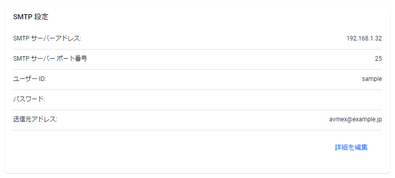 メール | AVM EXサーバー管理者の連絡先メールアドレスを入力します。 |