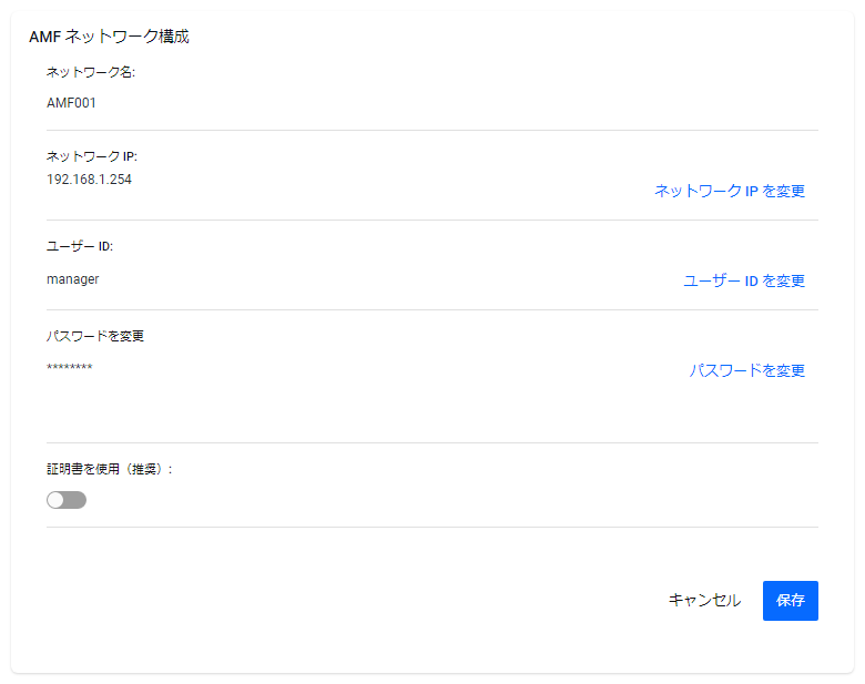 証明書を使用(推奨) | AMFデバイスとの認証に電子証明書を用いたTLSクライアント証明書認証を使用するかどうかを、オン(使用する)またはオフ(使用しない)から選択します。Note同認証を有効にするには、AMFコントローラー(またはAMFマスター)側でTLSクライアント証明書認証を有効にする必要があります。 |