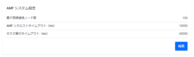 最大同時接続ノード数 | AMFトポロジー更新の際、一度にリクエストを送出するAMFデバイスの最大数を、10~100の値で指定します。デフォルトは100です。 小さな値を設定するとシステムの動作は安定しますが、トポロジー更新に要する時間が長くなります。 |