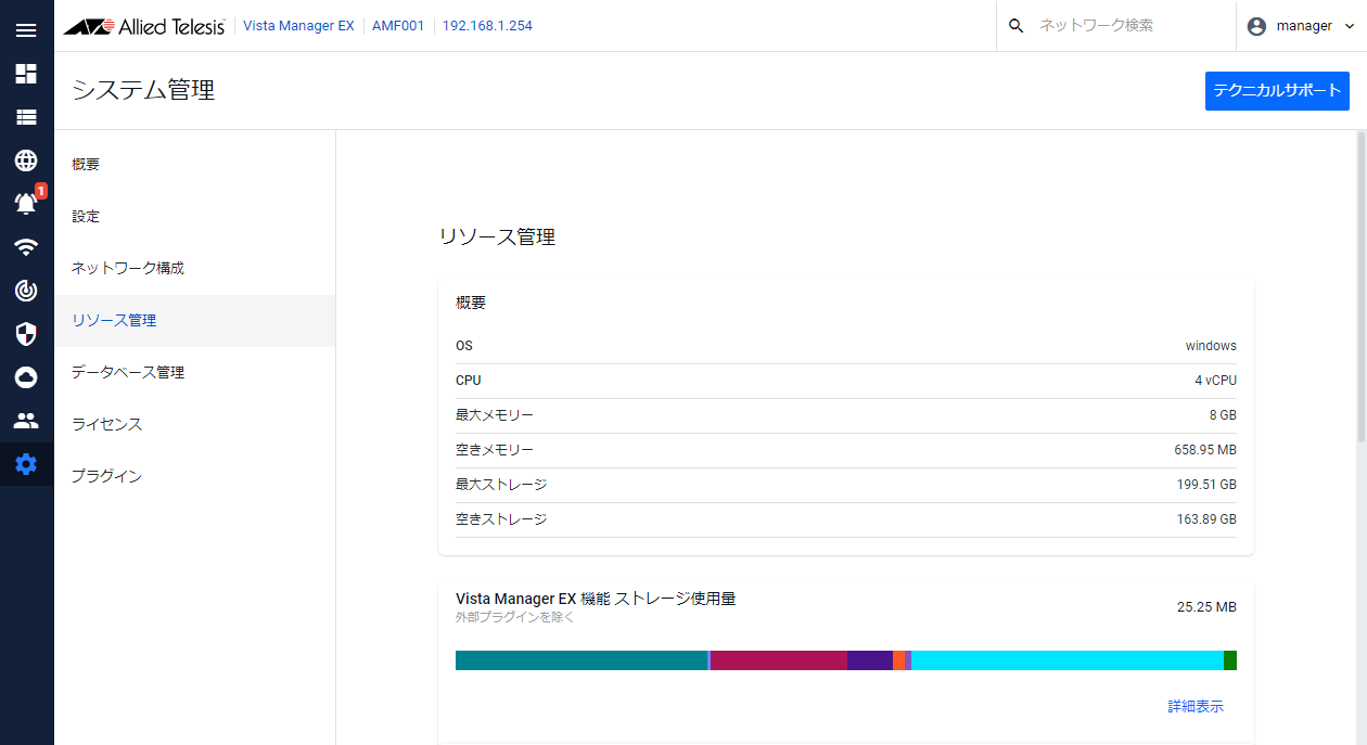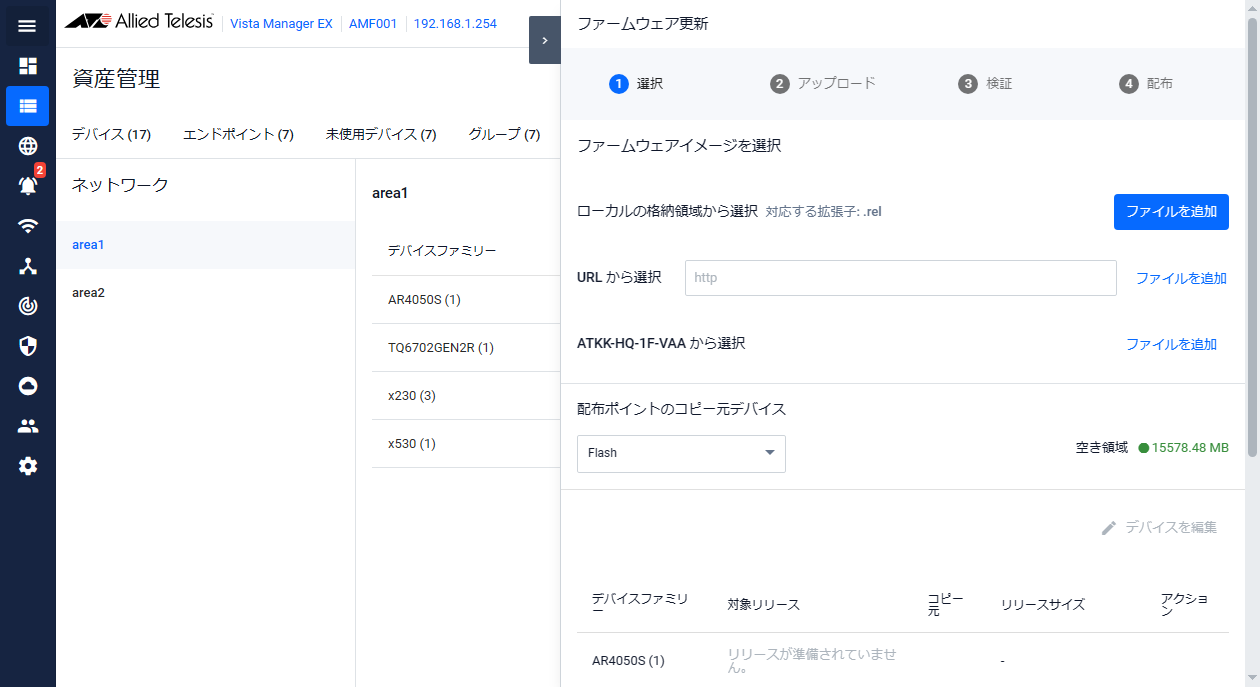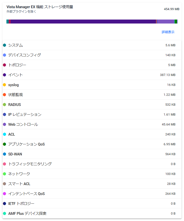 AMF Plusデバイス探索 | AMF Plusデバイス探索設定と使用データの保管に使用している領域の容量を表示します。 |
