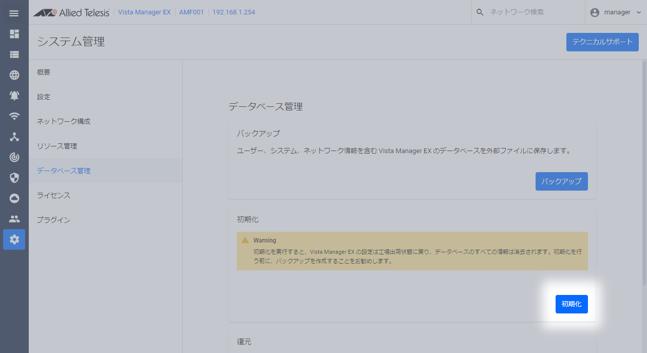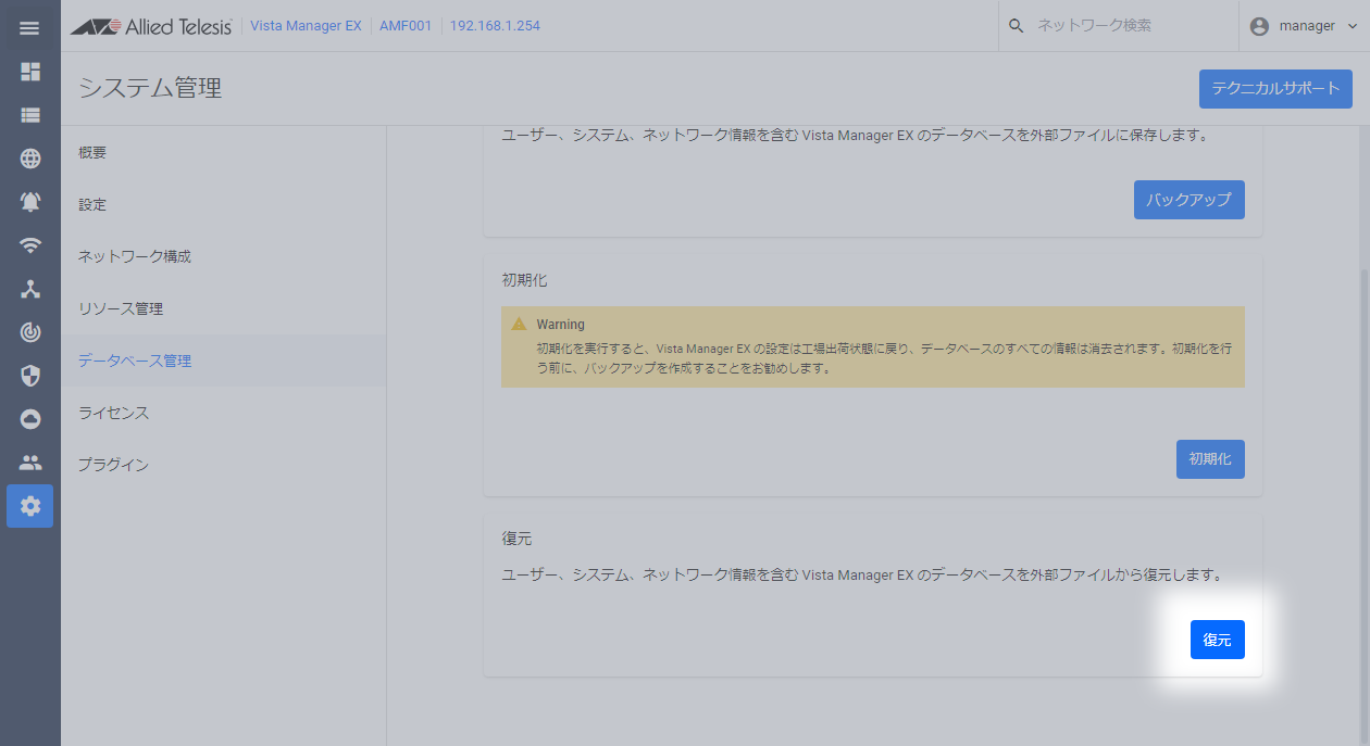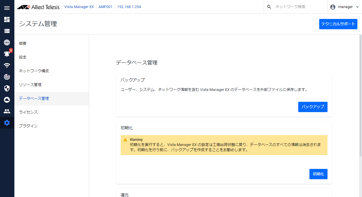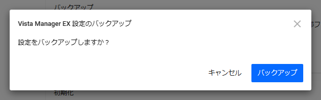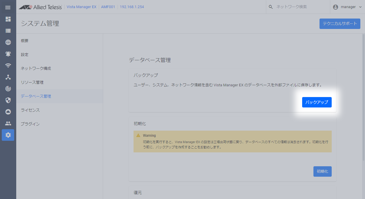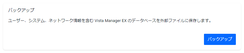 「バックアップ」ボタン | AVM EXの設定情報を外部ファイルにバックアップします。Noteバックアップの取得とテクニカルサポート情報の取得は同時に行えません。両方取得したい場合は、片方のファイルのダウンロードが完全に終了していることを確認してから、もう一方の情報を取得するようにしてください。 Noteバックアップに失敗した場合、エラーが表示されず、空のバックアップファイルがダウンロードされることがあります。バックアップを取得した際は必ずファイルサイズを確認してください。 |