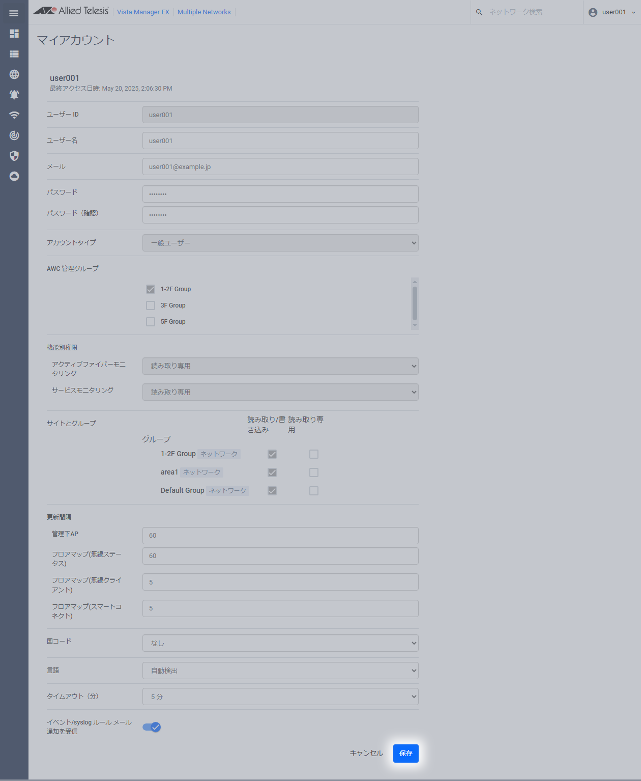 「保存」ボタン | AMFコントローラー(またはAMFマスター)のユーザーアカウントの変更を保存します。 |