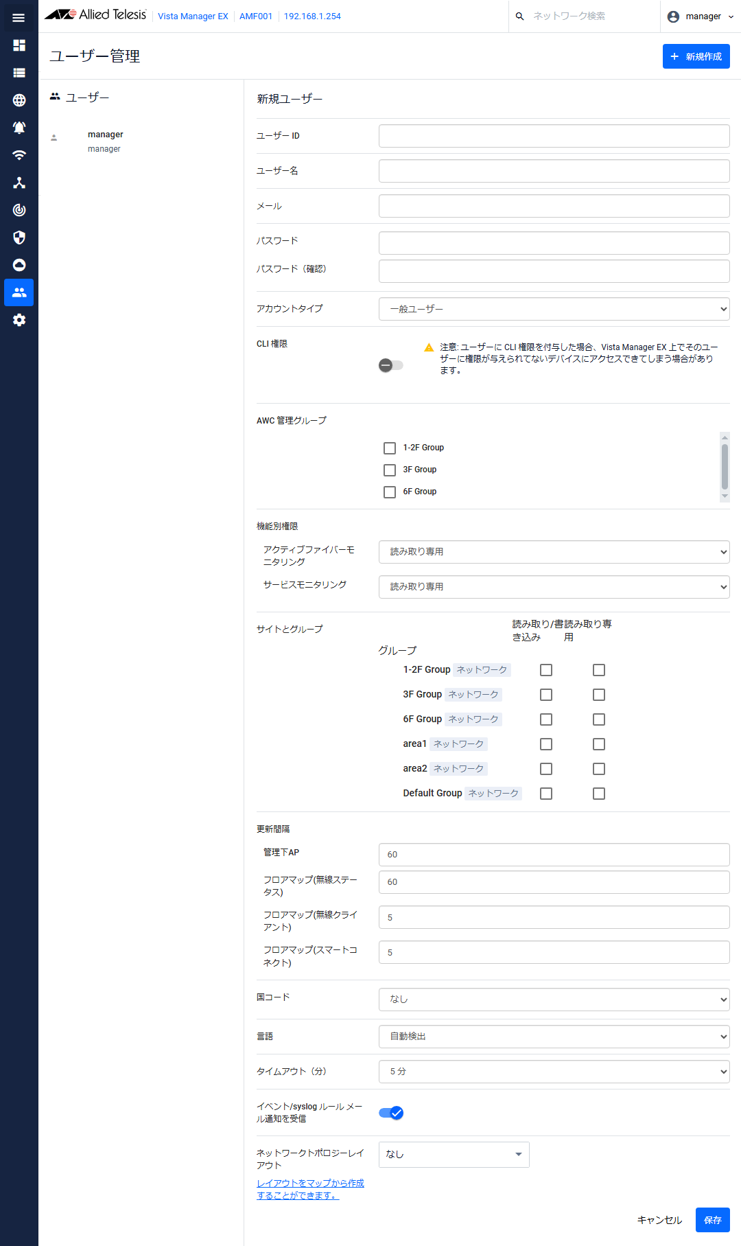 NoteAMFコントローラー(存在しない場合はAMFマスター)にて、事前にAVM EXからの管理用の権限レベル15のユーザーアカウントを作成し、AMFコントローラーまたはマスターのコンソール接続に使用するユーザーアカウントと分けることをお勧めします。