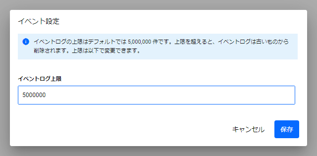 イベント | 保存しているイベントの数と、イベントメッセージの保管に使用している領域の容量を表示します。 |